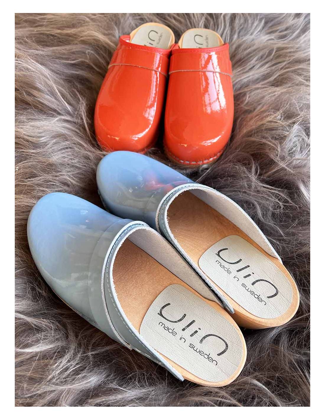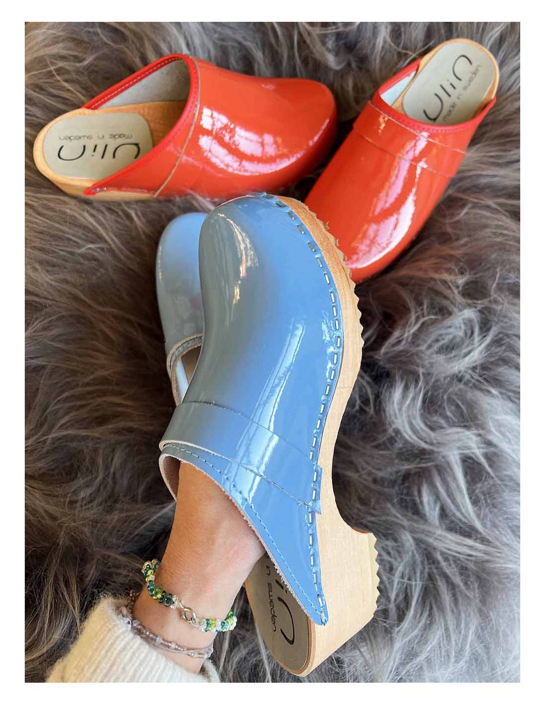 Handgefertigte schwedische Clogs für Frauen und Männer aus Erlenholz und farbigem Lackleder.