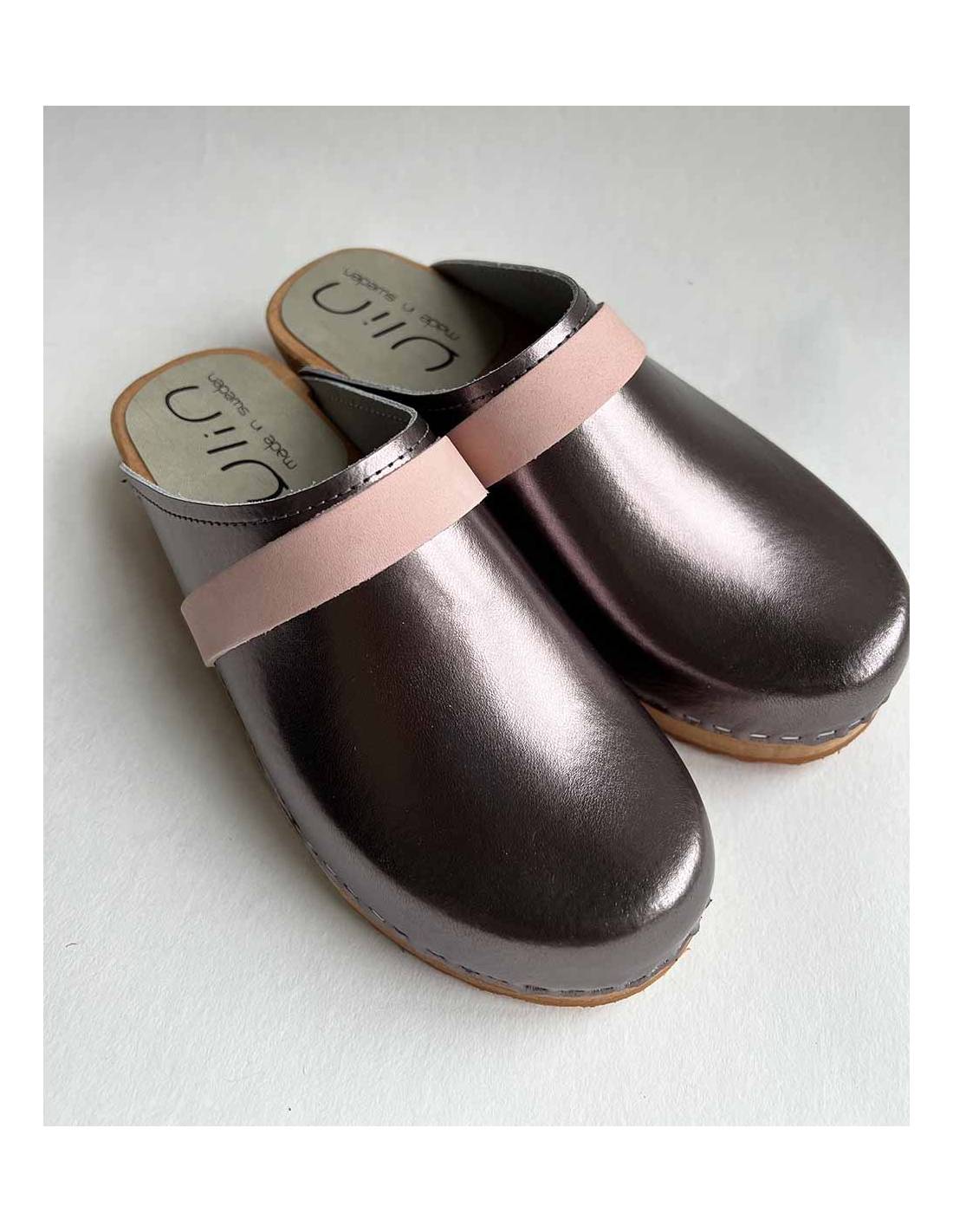 Ein Damenclog im nordischen Pantoffelstil mit vielen Farbschattierungen in Metallic-Pink, Metallic-Grün und Metallic-Zinn.