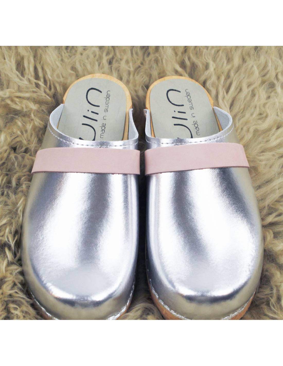 Metallisiertes zinnfarbenes Leder und samtiges Nubuk-Wildleder in Blassrosa