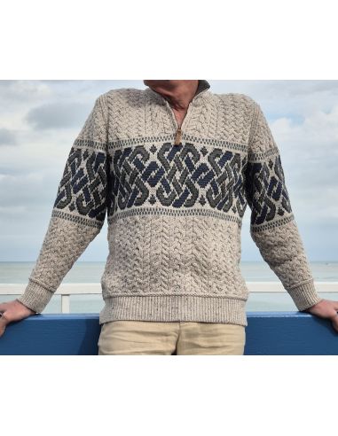 Der traditionelle irische Pullover aus weicher und warmer reiner Merinowolle. Ein schöner Pullover, der dank seiner doppelten Strickschicht für eine bessere Wärmeisolierung vor Kälte und Wind schützt. Reißverschluss, keltisches Muster, gestrickt.