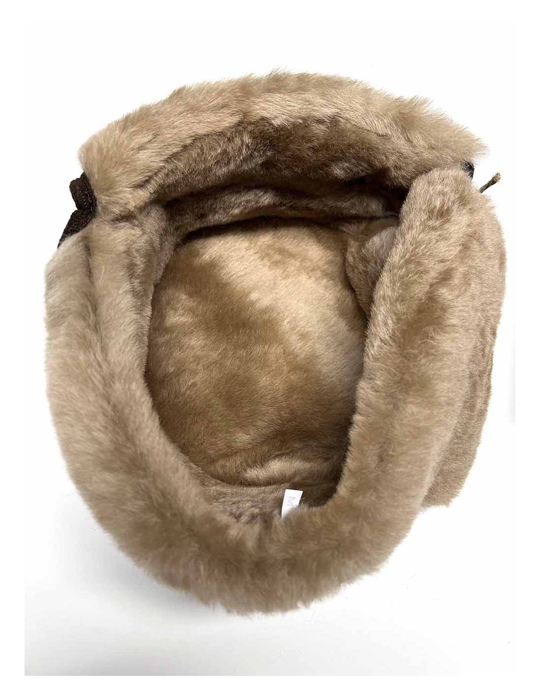 Chapkas finished in brown leather and cream wool or mocha skin with unbleached sheepskin wool.