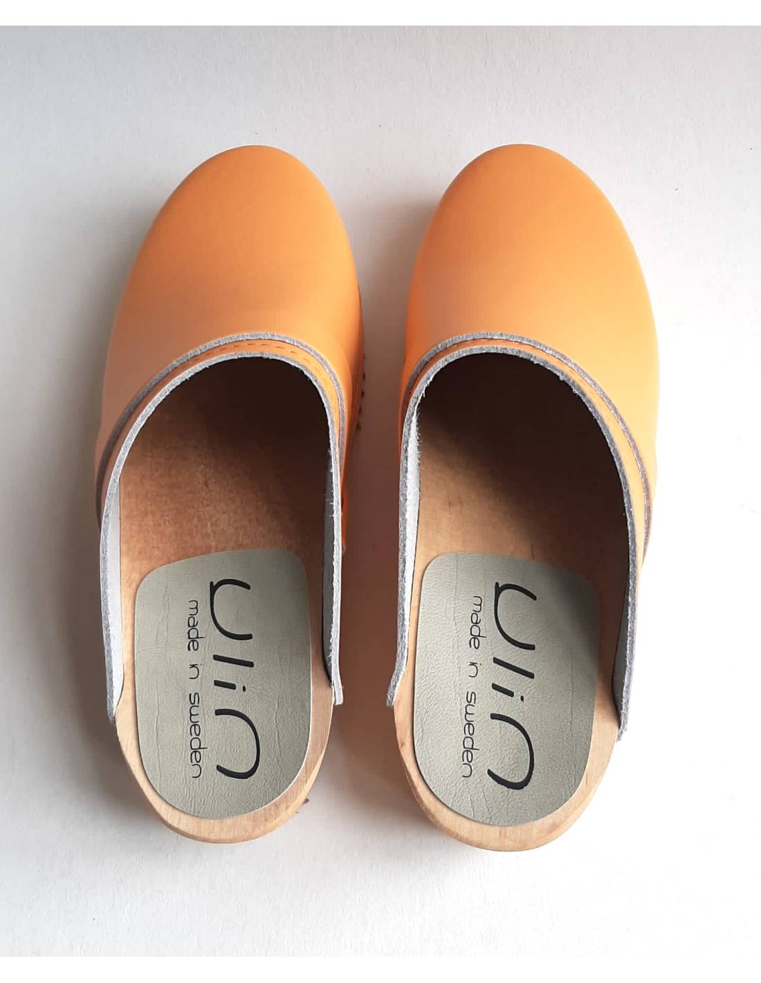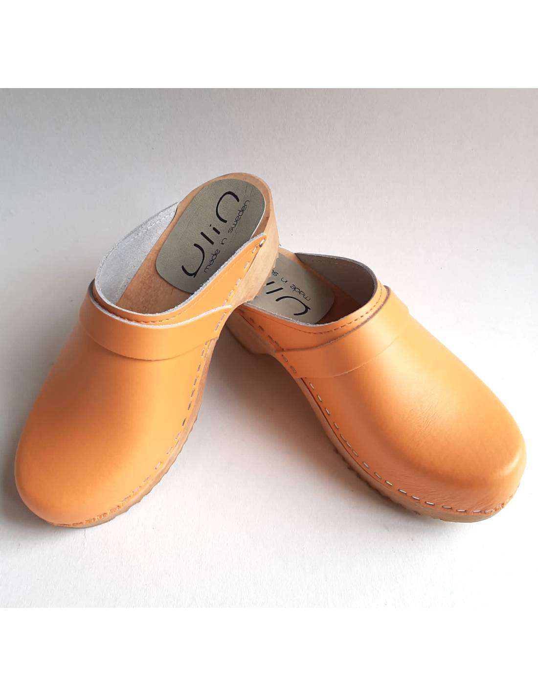 Swedish YLIN clogs adorned with a sewn edge .