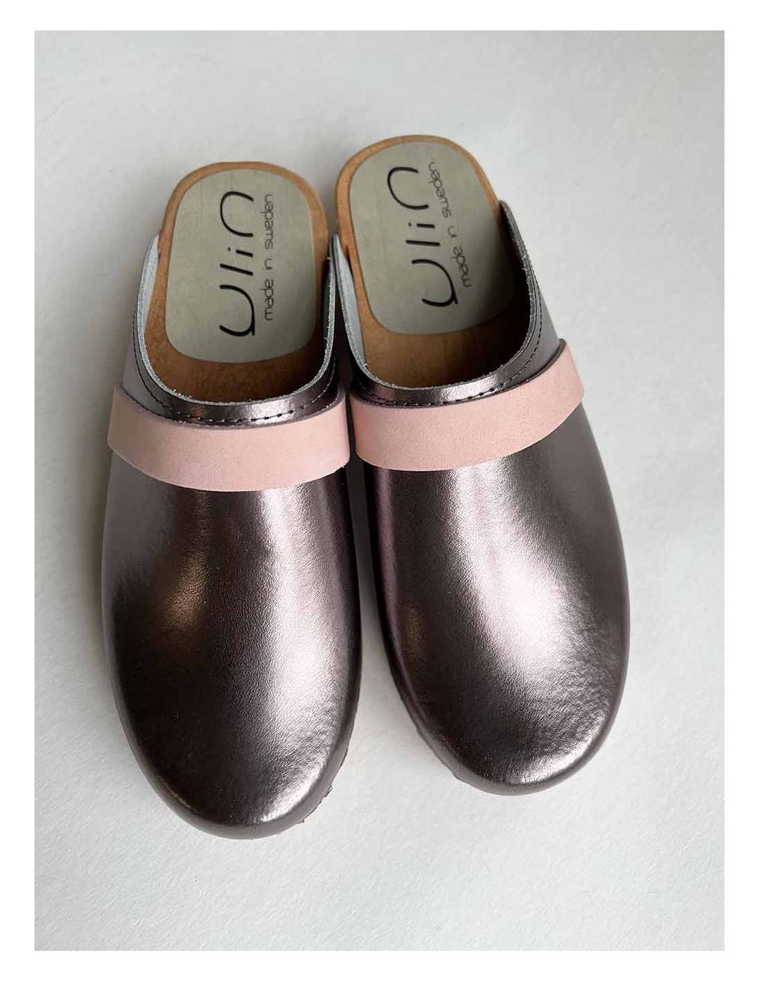 Un zueco de mujer de estilo mula nórdica con múltiples tonos de rosa metalizado, verde metalizado y peltre metalizado.