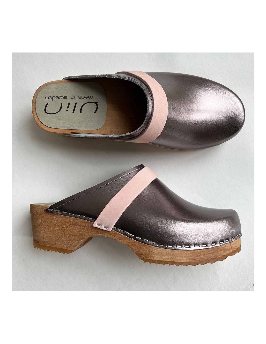 Descubra los zuecos suecos Ylin POWER, de madera y piel metalizada con tiras de piel vegetal o PU.