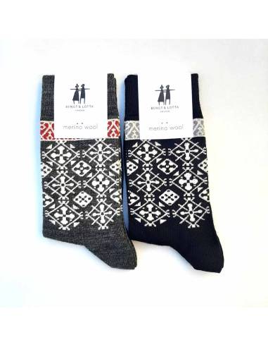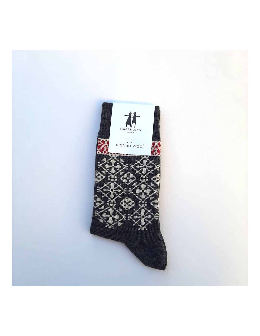 Chaussettes créateurs laine mérinos fantaisie bengt and lotta design nordique  noir et gris  motifs ethnique