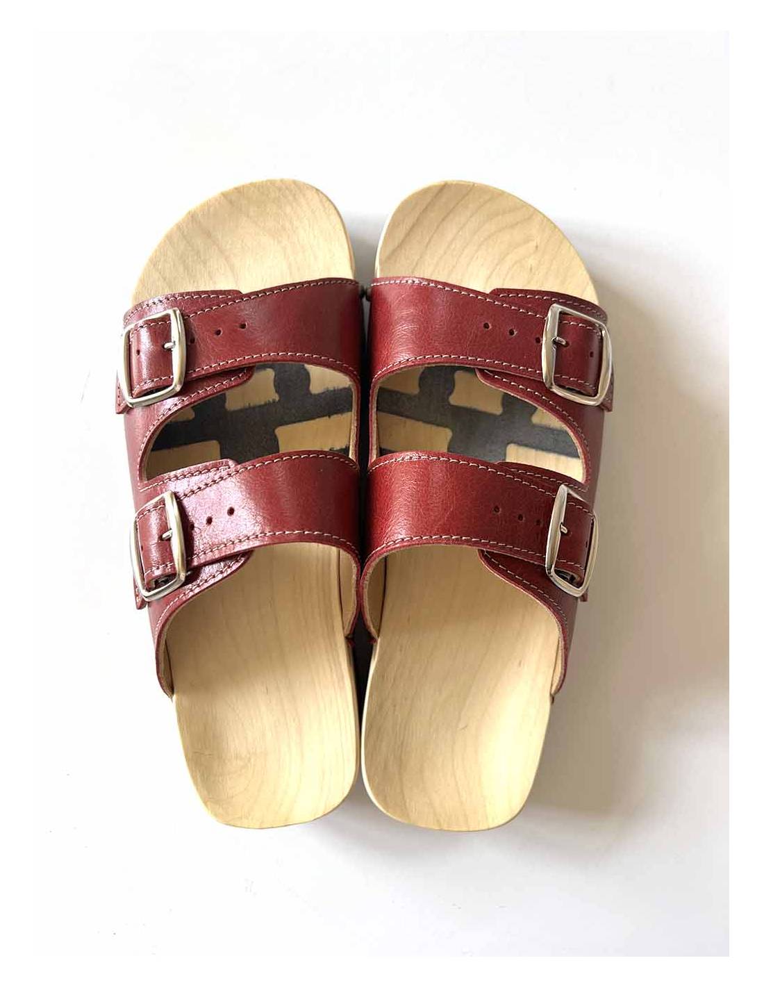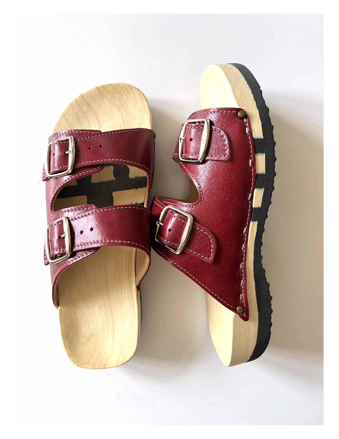 Claquettes bois en cuir double boucle avec semelle mixte bois et caoutchouc en rouge bordeaux écarlatte
