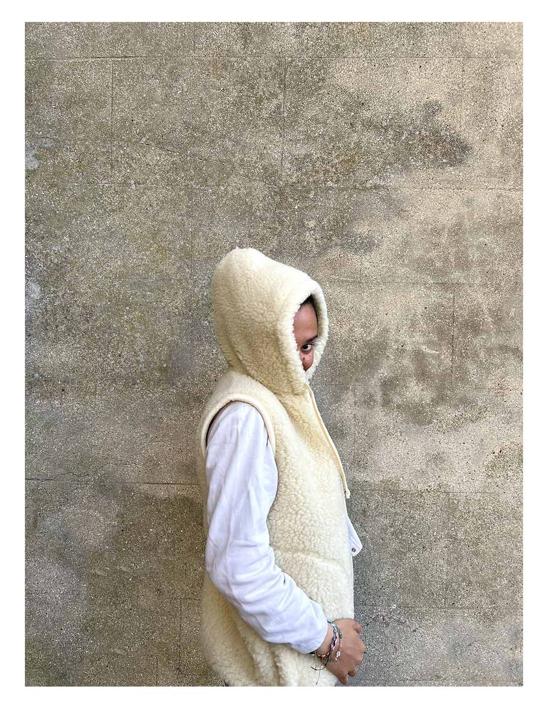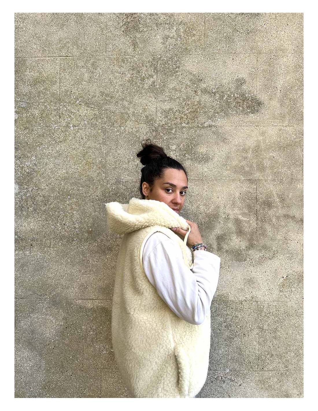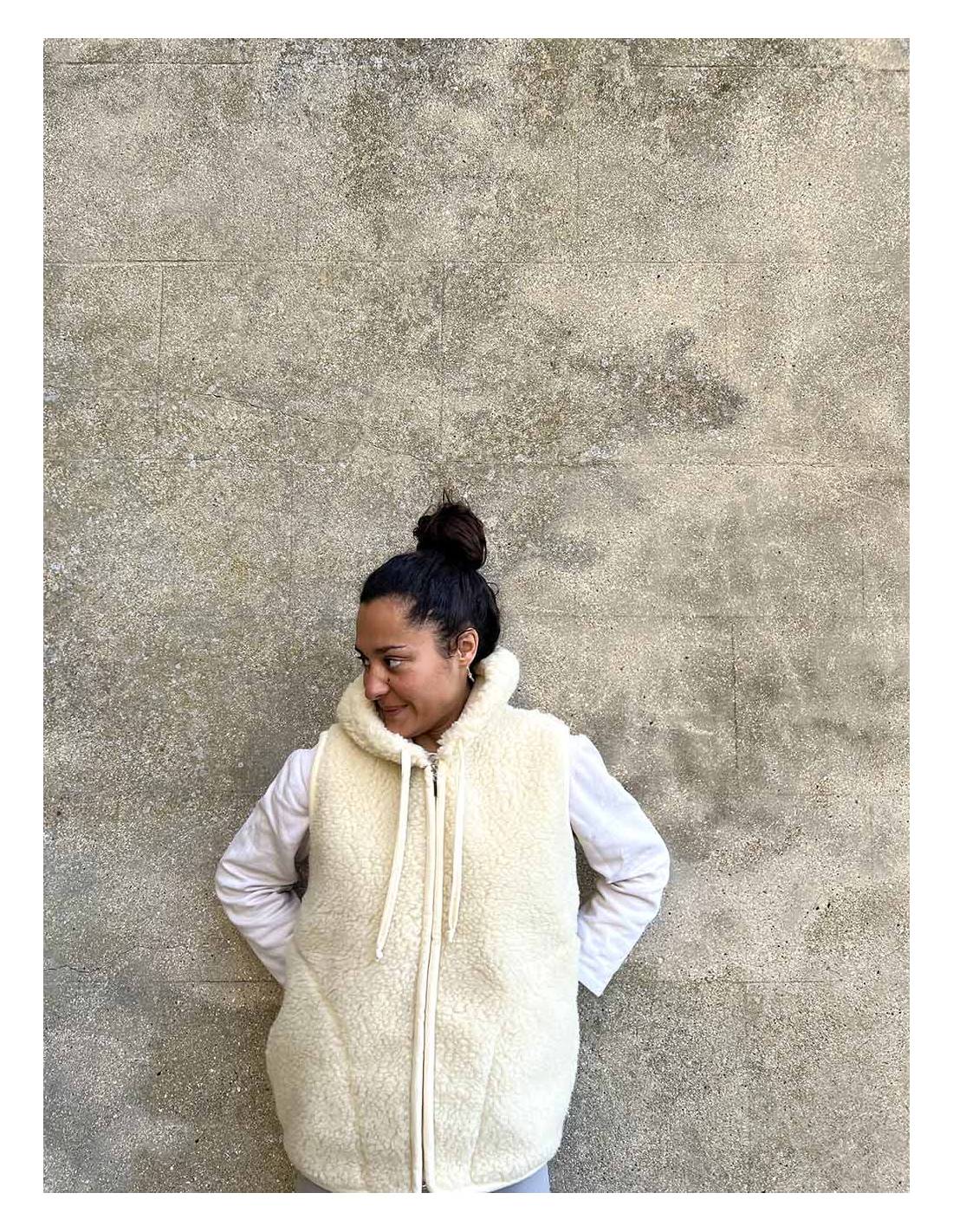 Veste pure laine avec capuche et fermeture ZIP sans manche couleur écru ou blanc cassé