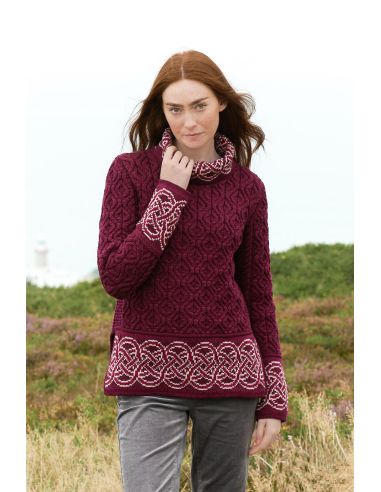 Un pull femme jacquard irlandais en pure laine mérinos douce et chaude. Un très beau pull avec des motifs raffinés, maille intarsia et une coupe mettant en valeur la silhouette féminine.