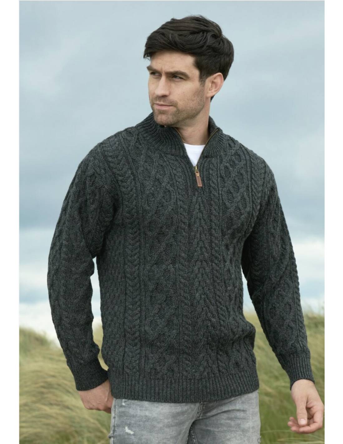 Le pull traditionnel irlandais en pure laine mérinos douce et chaude. Un très beau pull qui protège du froid et du vent grâce à sa double couche tricotée pour une meilleure isolation thermique. Fermeture par Zip, maille motif chevrons.