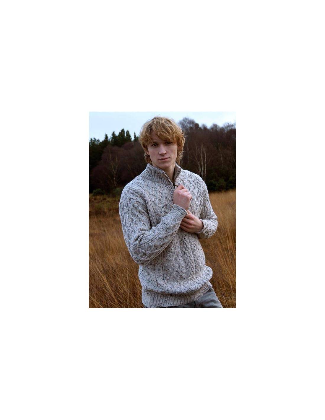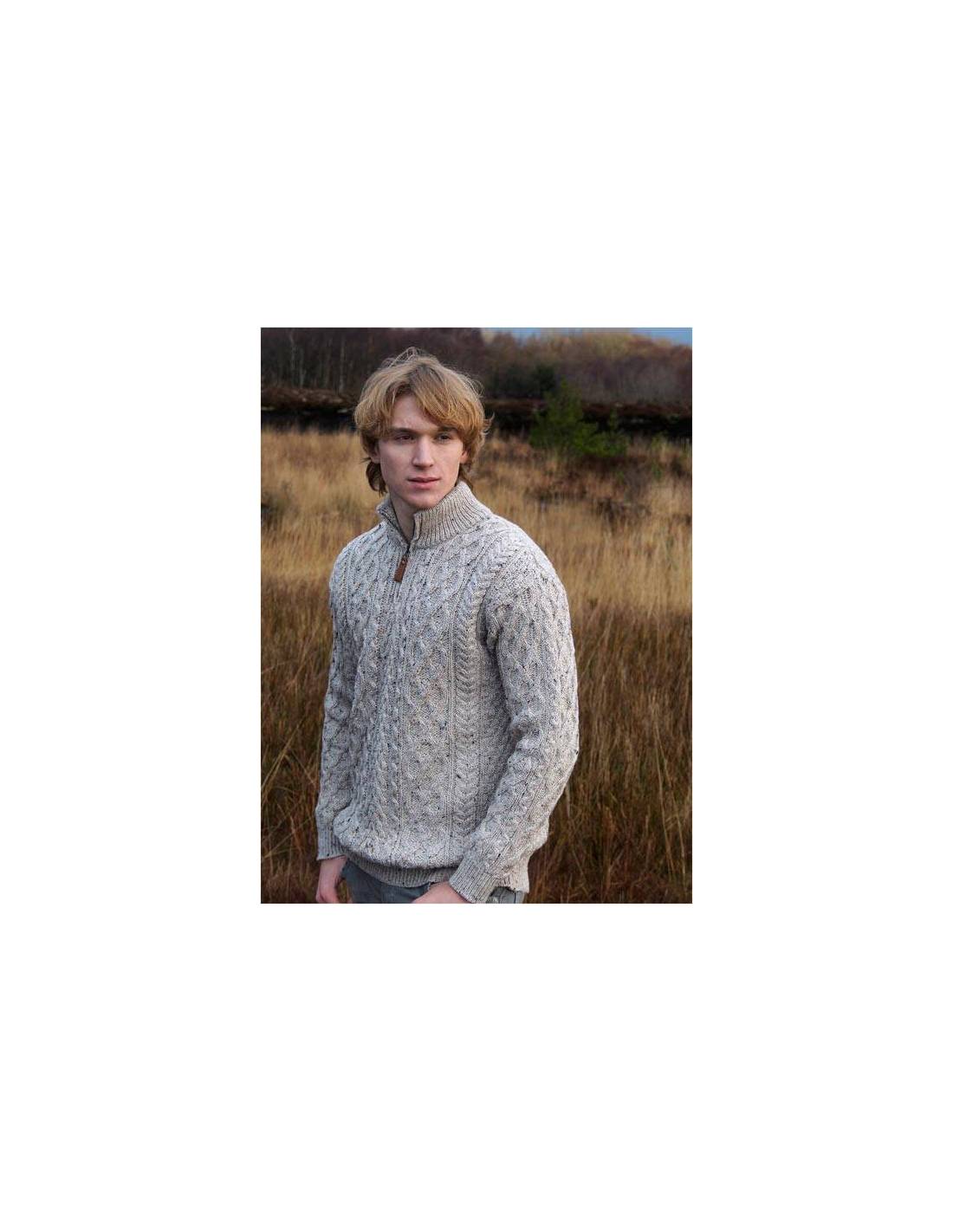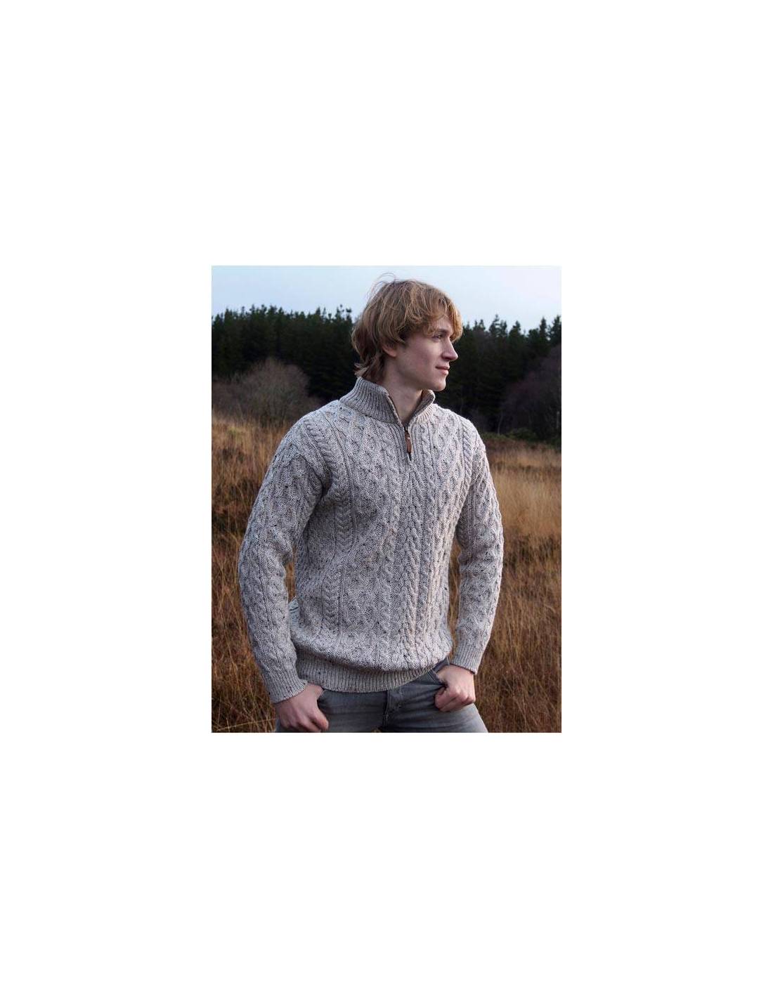 Le pull traditionnel irlandais en pure laine mérinos douce et chaude. Un très beau pull qui protège du froid et du vent grâce à sa double couche tricotée pour une meilleure isolation thermique. Fermeture par Zip, maille motif chevrons.