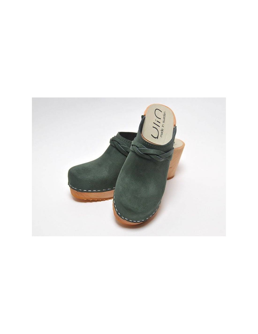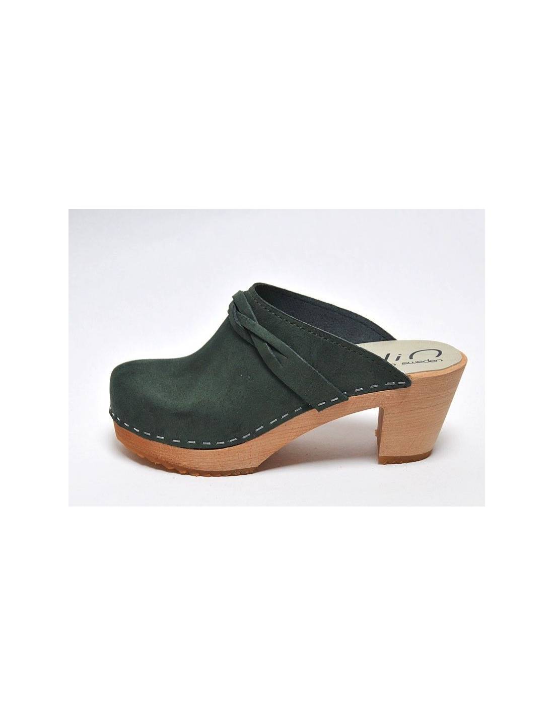 Sabots suédois verts femme talons hauts bois et cuir végétal et nubuck