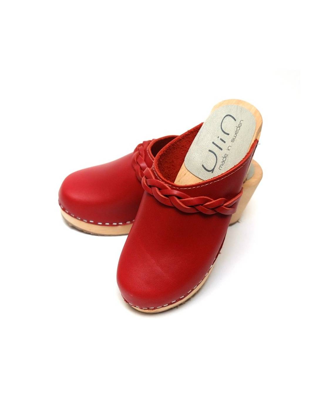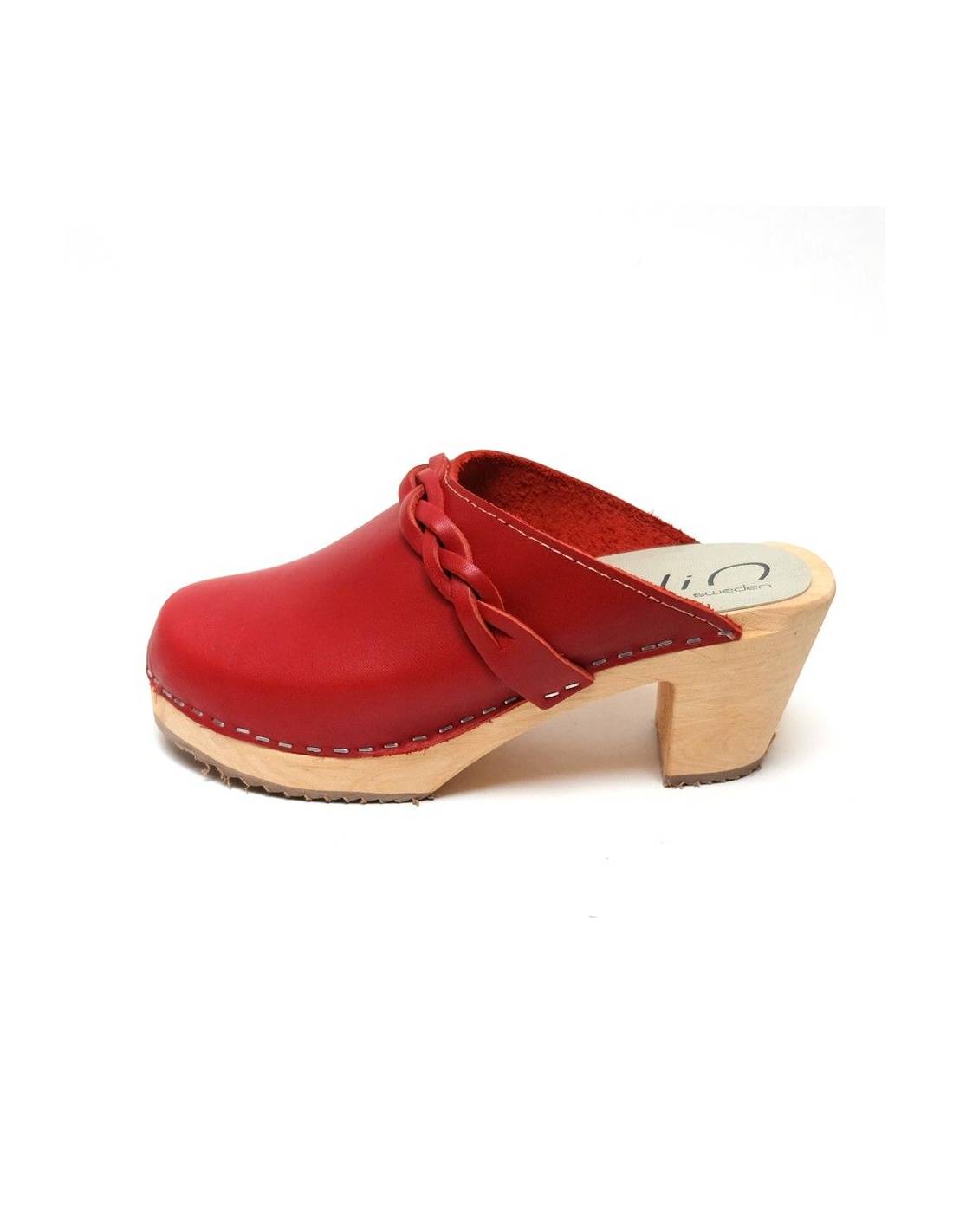 Chaussures mules femme en bois avec bride tressée particulièrement élégant.