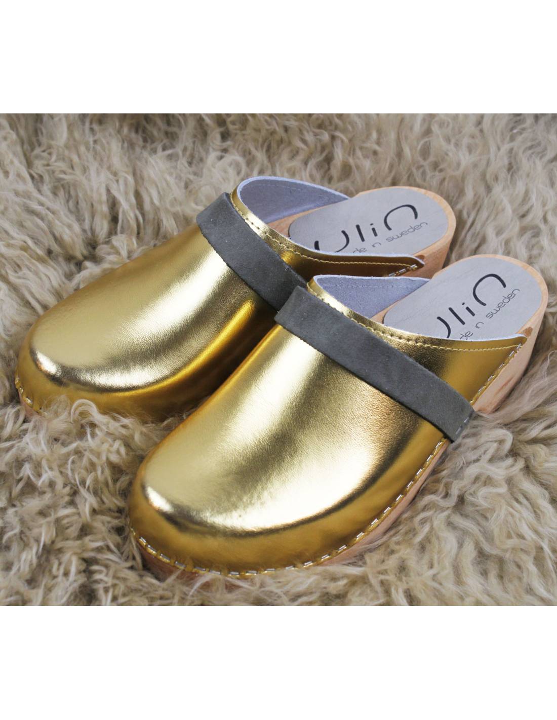 Découvrez les sabots femme suédois Ylin collection POWER, en bois et cuir métallisé avec bandes cuir bimatière & bicolore.